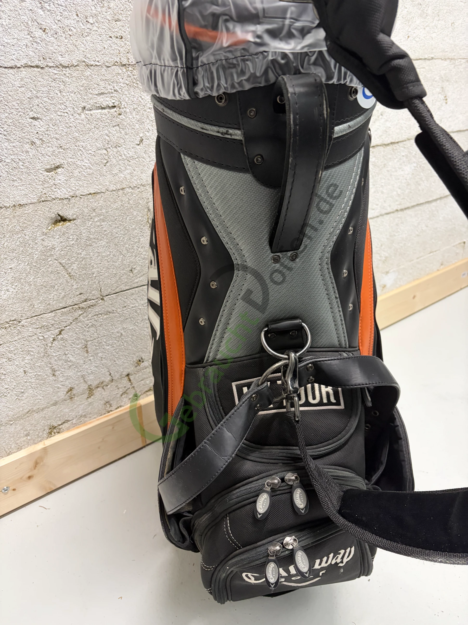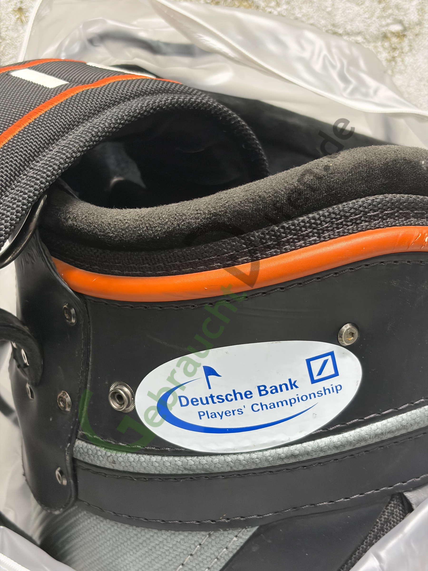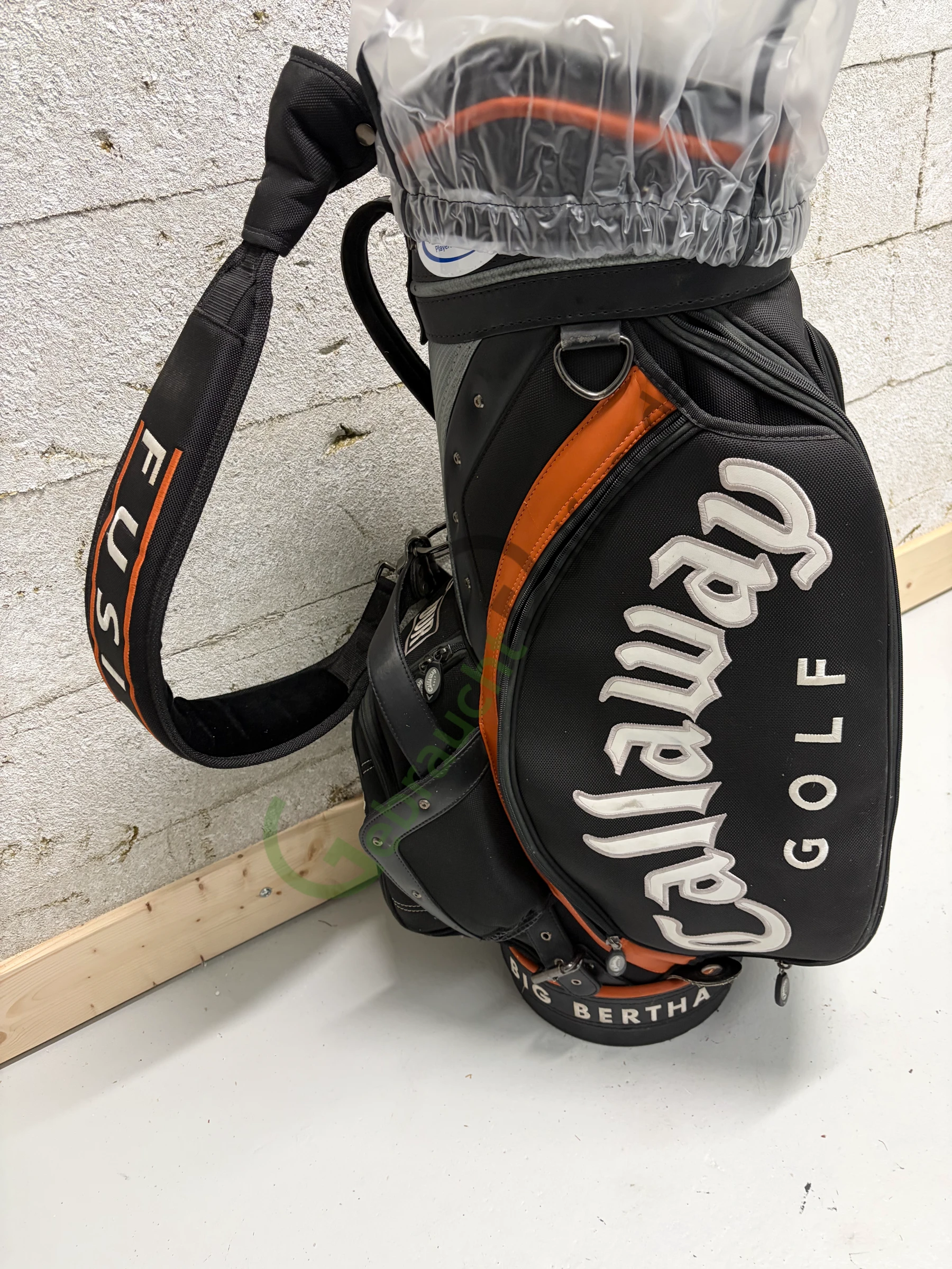 Gebrauchtes Staffbag von Callaway aus der Big Bertha Fusion-Serie mit 6 Schlägerfächern und 7 Seitenfächern. Herausgegeben auf der Deutsche Bank Players Championship 2005.