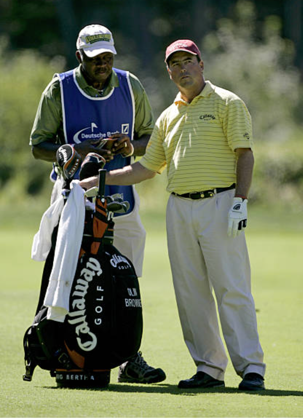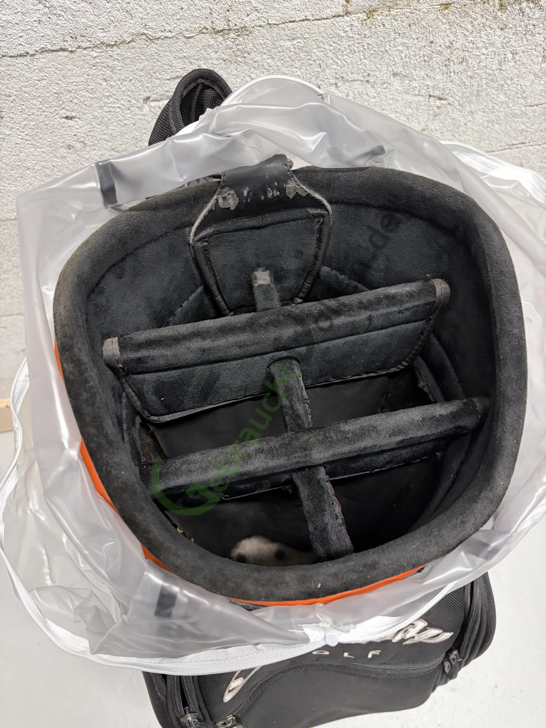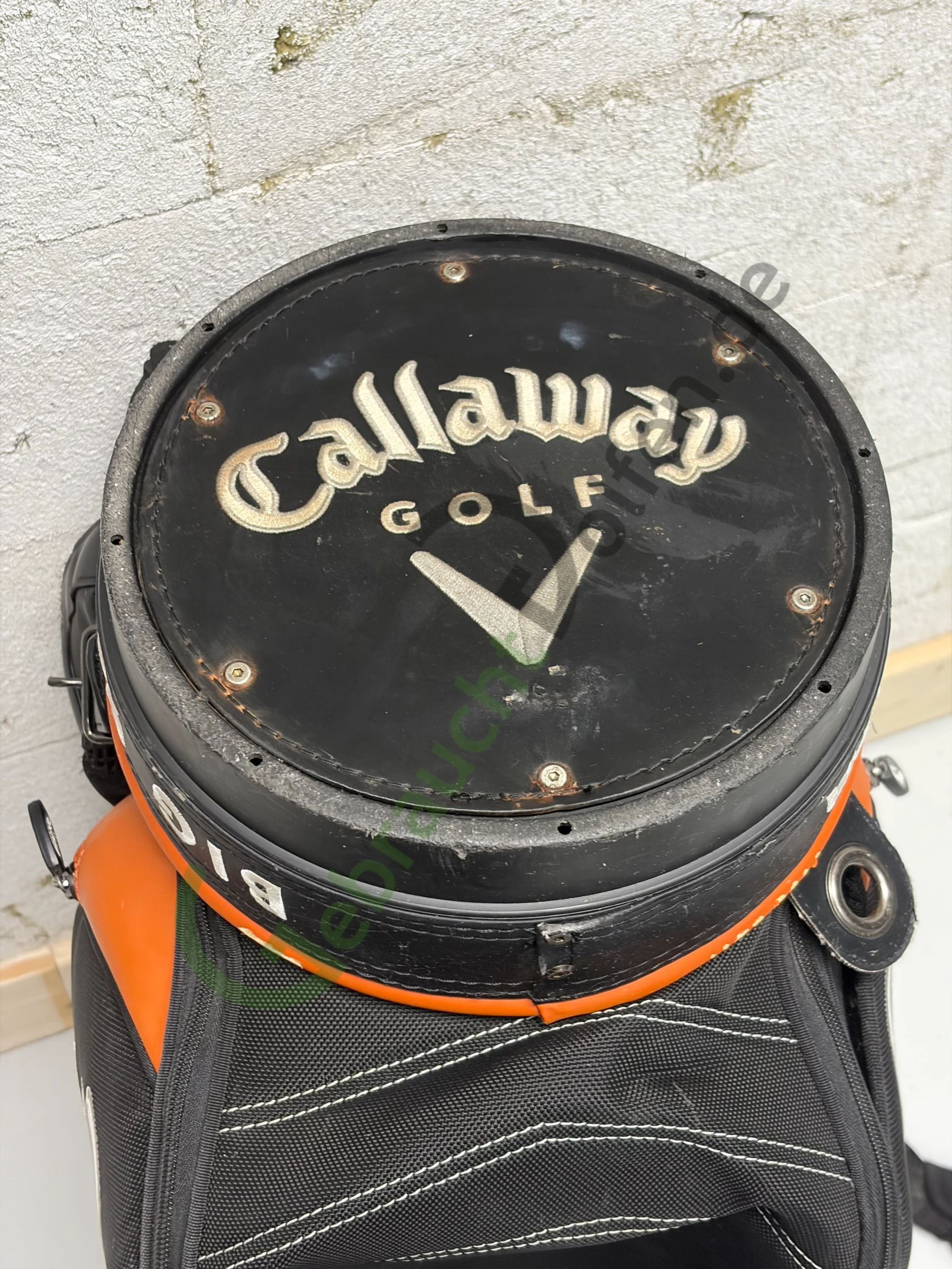Gebrauchtes Staffbag von Callaway aus der Big Bertha Fusion-Serie mit 6 Schlägerfächern und 7 Seitenfächern. Herausgegeben auf der Deutsche Bank Players Championship 2005.