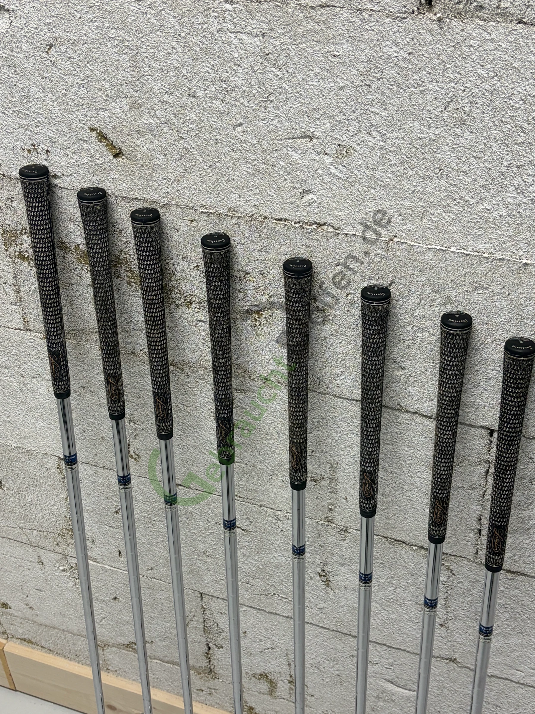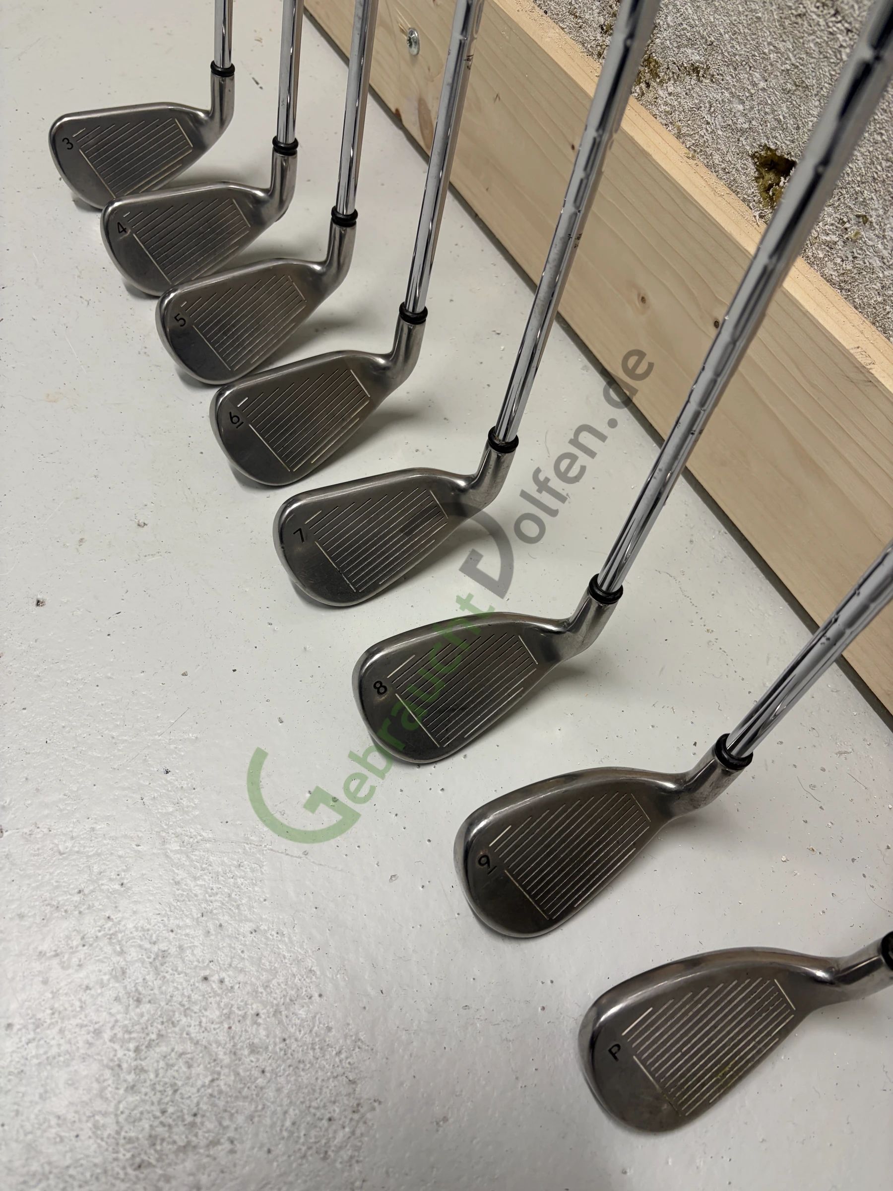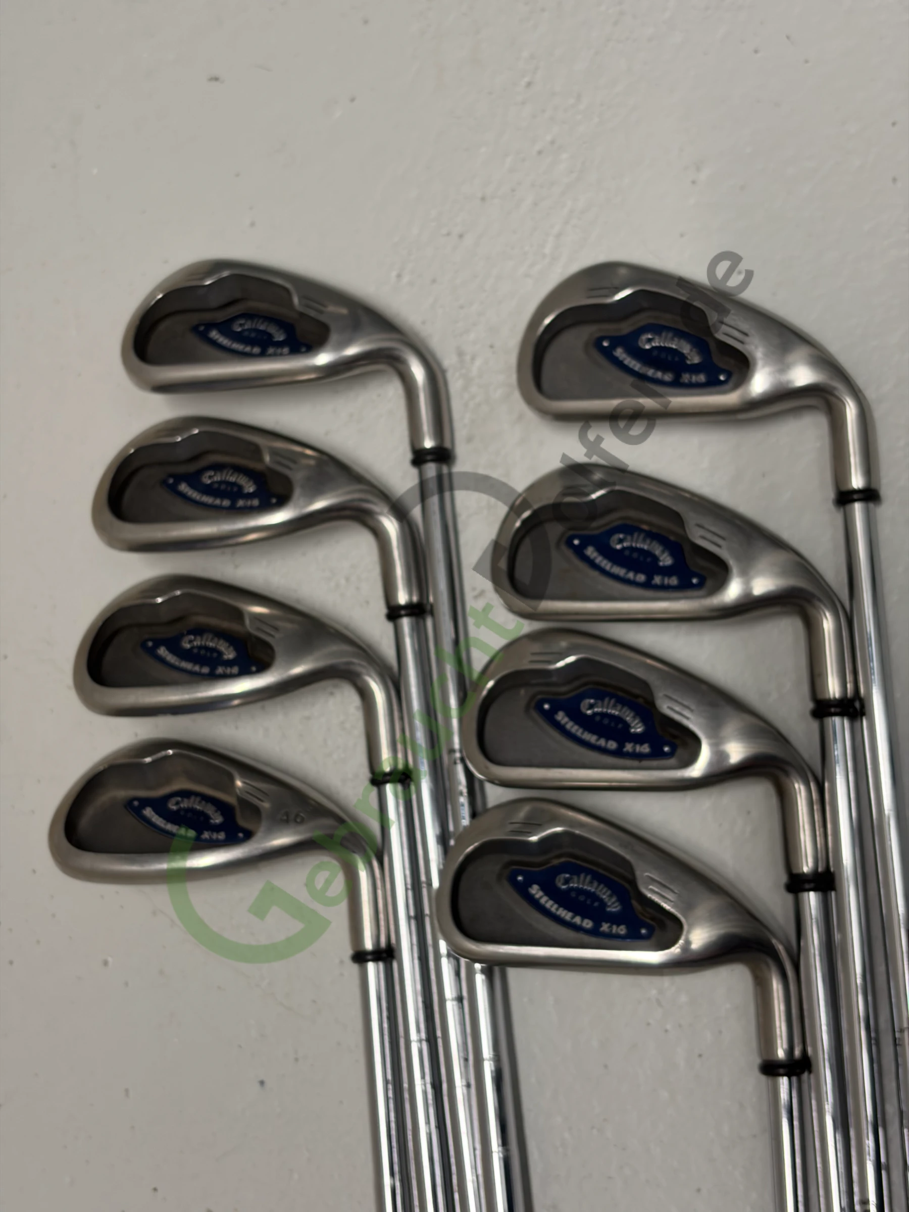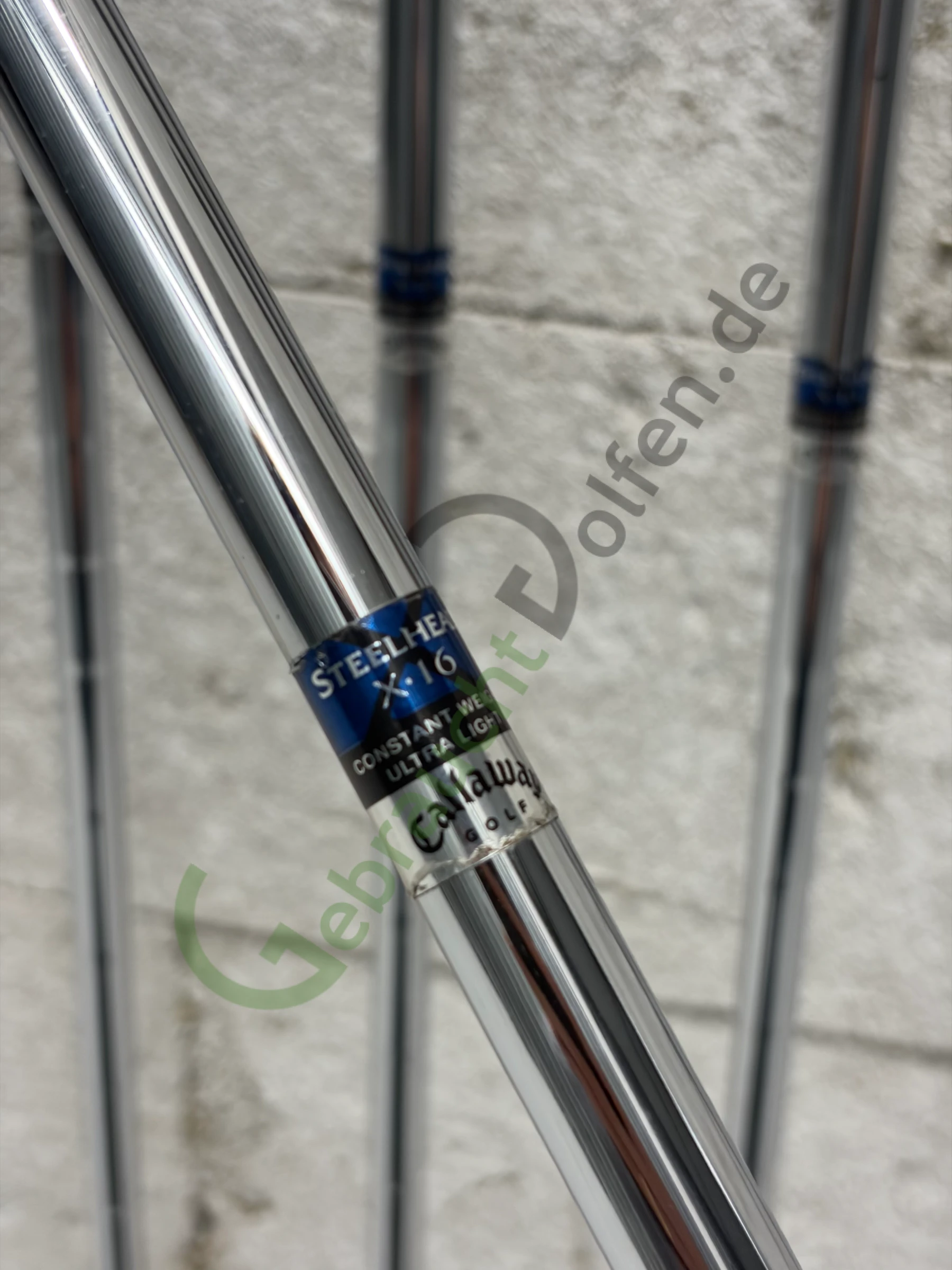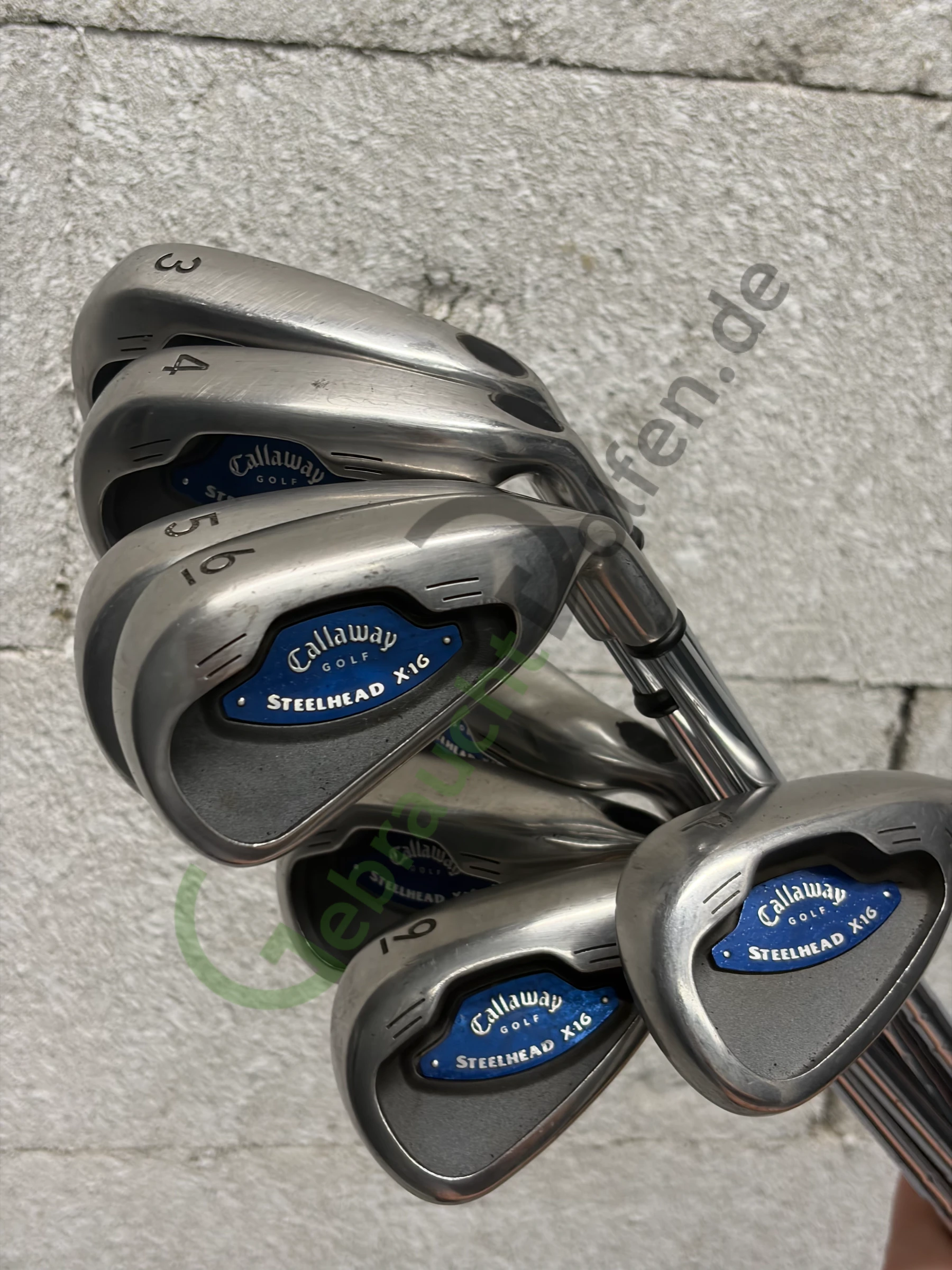 Gebrauchter Eisensatz von Callaway aus der X-16-Serie von Eisen 3 bis Pitching Wedge und Stahlschaft um einen Zoll bzw. 2,53 cm verlängert in Uni-Flex (zwischen Stiff- und Regular-Flex) für Rechtshänder.
